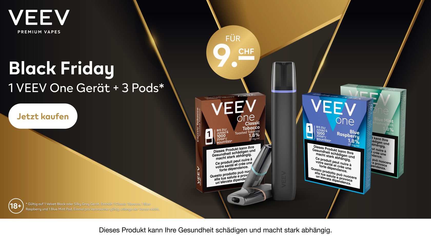 Home » Shop-Deals » Verschiedenes » 1 VEEV One Gerät + 3 Pods* für CHF 9.- 1 VEEV One Gerät + 3 Pods* für CHF 9.- frank 24. November 2025 VerschiedenesIQOS days 0 0 hours 0 0 minutes 0 0 seconds 0 0 Deal Score+450 0 Zum Deal Deal Score+450 Zum Deal Werbung VEEV Black Friday: 1 VEEV One Gerät + 3 Pods* für CHF 9.-. Wähle zwischen 1 Gerät in Velvet Black oder Silky Grey. Jetzt kaufen
